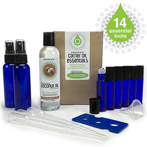 Essenzia Essential Oil Tools & Accessories - Aromatherapy Carrier Oil Kit: 4oz MCT Coconut Oil, Essential Oil Tool, Glass 10ml Roller Bottles & Glass 2oz Spray...