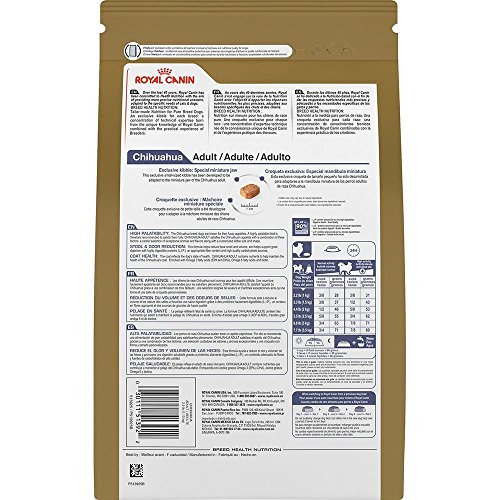 -. Binding : Misc. -. Brand : Royal Canin -. EAN : 0764999723882 -. Feature : Intense flavors and aromas to stimulate even the most delicate appetite in adult Chihuahua's over 8 months of age / L-carnitine, moderate sodium levels and antioxidants to support heart health for the long-life span of the Chihuahua / Sodium tripolyphosphate and a specialized kibble create a brushing effect, helping to reduce plaque and tartar / For Chihuahua's over 8 months old -. Label : Royal Canin -. Manufacturer : Royal Canin -. PackageQuantity : 1 -. ProductGroup : Pet Products -. ProductTypeName : PET_SUPPLIES -. Publisher : Royal Canin -. Studio : Royal Canin -. Title : 2.5-Pound Bag, Chihuahua Dry Dog Food -. UPC : 764999723882