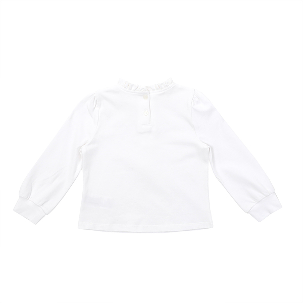 상품설명 O.WH 프릴 TS입니다. 중심에 들어간 입체 플라워 장식이 페미닌하면서도 유니크한데요. 프릴 네크라인으로 사랑스럽게 연출하실수 있습니다.