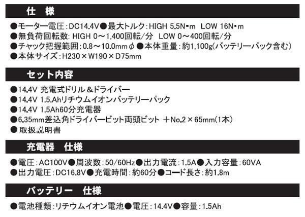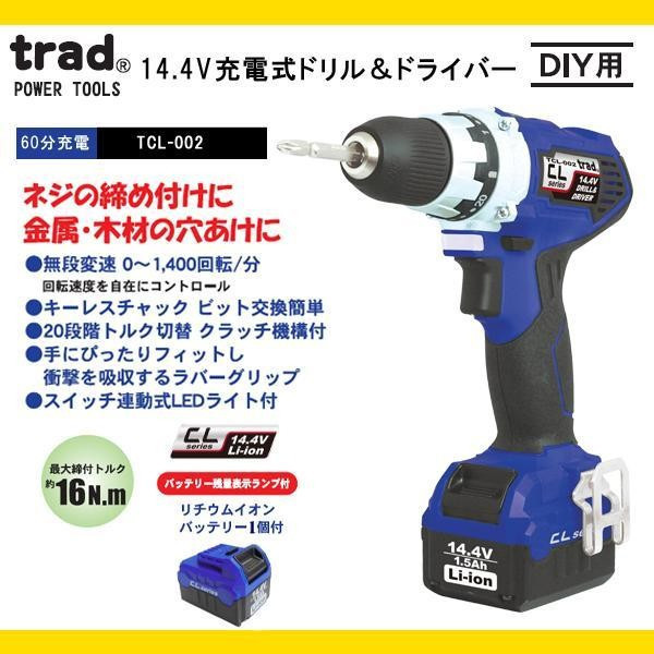 人気のDIY工具!バッテリーがシリーズ共通で使える!ネジの締め付けに、金属や木材の穴あけに。 製造国:中国 素材・材質:樹脂 商品サイズ:H230×W190×D75mm 重量:約1100g(バッテリー含む) ※サプライヤー直送品 ご注文後3~4営業日後の出荷となります【商品名】TRAD 14.4V 充電式ドリル&ドライバー TCL-002