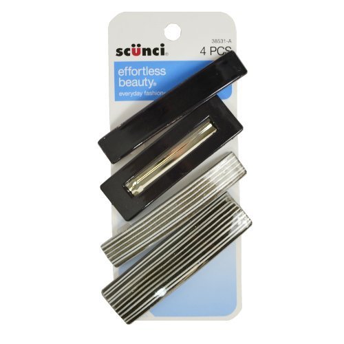 -. Binding : Health and Beauty -. Brand : Scunci -. EAN : 0043194385317 -. Feature : *Holds all hair types / *One black and one dark brown in each pack with either 2 silver or 2 gold lined barrettes for a total of four barrettes / *Made for everyday fashion -. IsAdultProduct : 0 -. Label : Conair Corporation/L&N -. Manufacturer : Conair Corporation/L&N -. MPN : 777684 -. PackageQuantity : 2 -. PartNumber : 777684 -. ProductGroup : Health and Beauty -. ProductTypeName : HEALTH_PERSONAL_CARE -. Publisher : Conair Corporation/L&N -. Studio : Conair Corporation/L&N -. Title : Scunci Barretts, 4 Piece (2 Pack) -. UPC : 043194385317