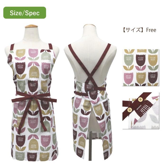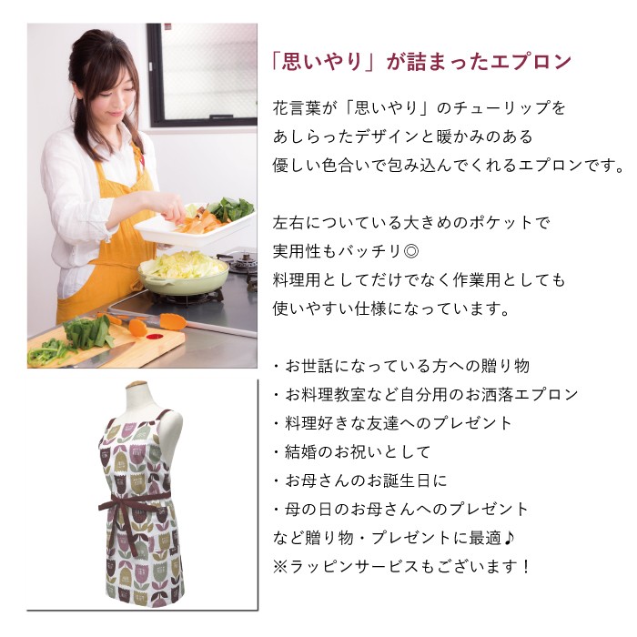チューリップの花言葉は『思いやり』 暖かい色合いで、 優しく体を包み込んでくれる、おしゃれで可愛いエプロンです。 ■サイズ フリー 着丈(胸元のレースから裾まで) : 約71cm  ウエスト : 約84cm 腰紐(片側): 約90cm ■材 質 綿100%