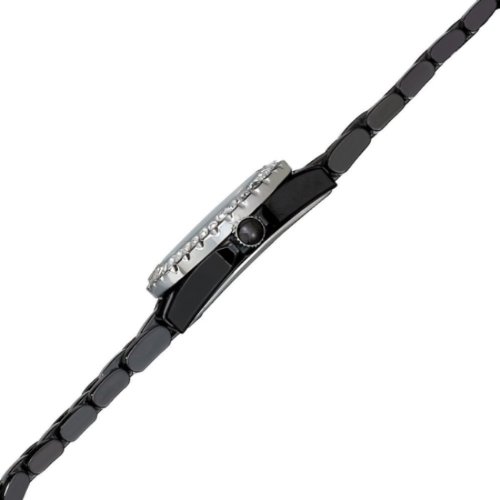-. Feature : Fully ceramic case and bracelet / Three interchangeable silver tone crystal, baguette, and ceramic bezels / Crystal hour markers / Date display at 4:30 position / Not water resistant