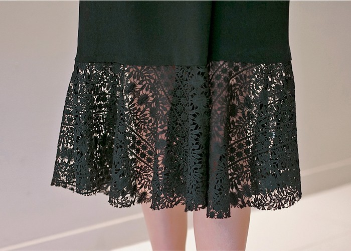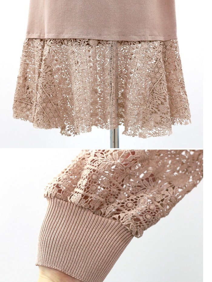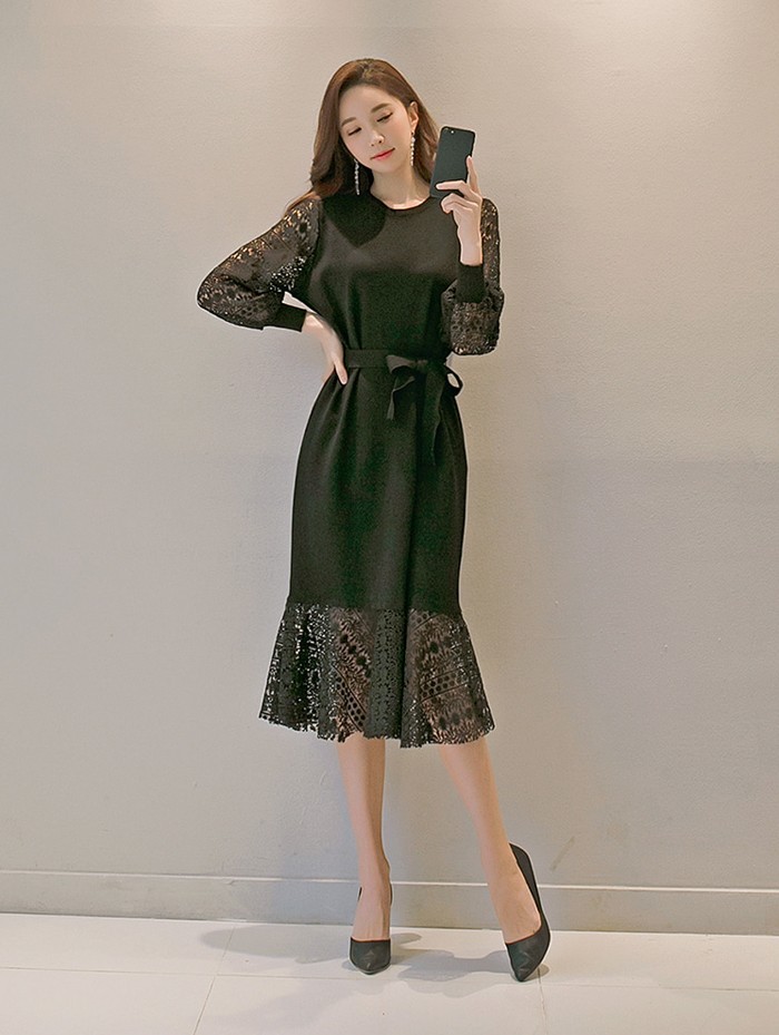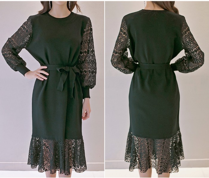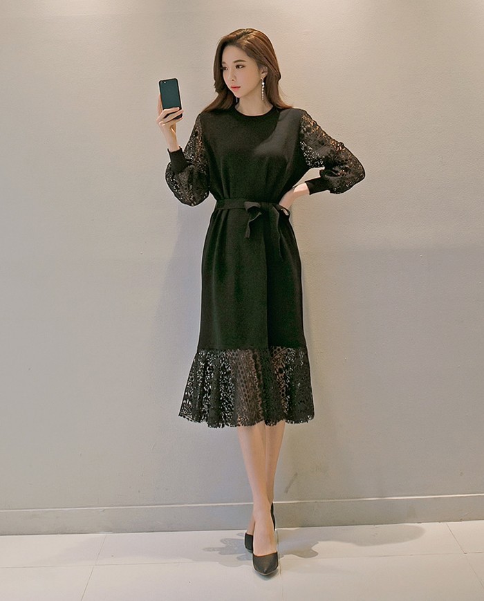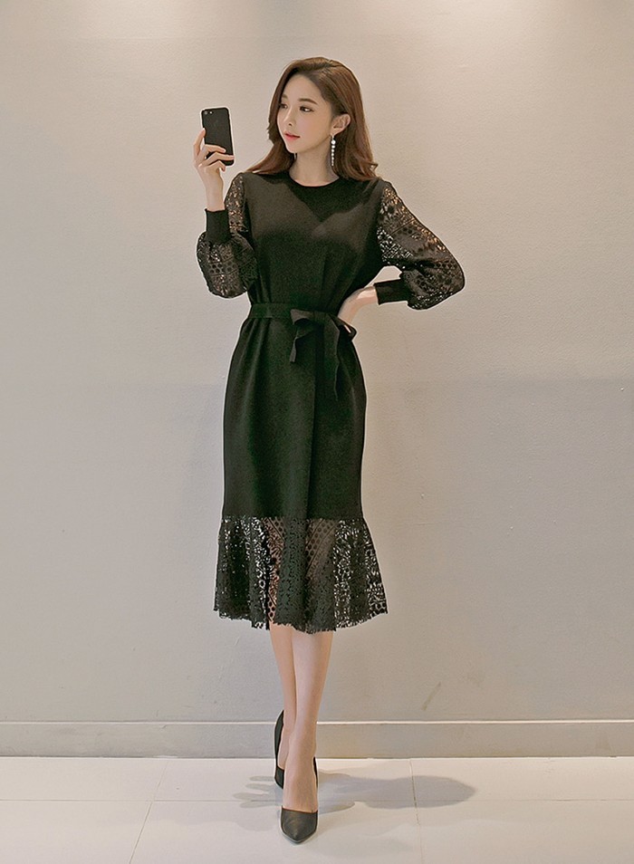 商品名:ワンピース ロング丈 レース配色 長袖 きれいめ
