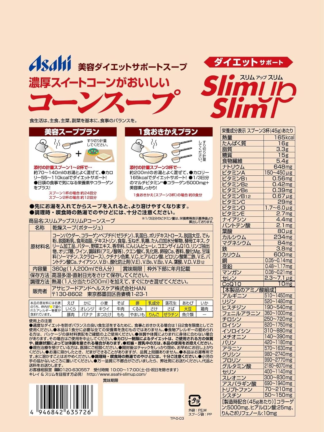 原材料 : スイートコーン、コラーゲン(ゼラチン)、乳蛋白、ポリデキストロース、大豆蛋白、澱粉、脱脂粉乳、食用油脂、デキストリン、食塩、オニオンエキス、乳糖、ミルポア、蛋白加水分解物、リンゴ抽出物、乳加工品、ビール酵母エキス、香辛料、コエンザイムQ10、オリゴ糖、調味料(アミノ酸等)、クエン酸K、乳化剤、卵殻Ca、香料、酸化Mg、甘味料(ソーマチン、スクラロース)、クチナシ色素、V.C、ヒアルロン酸、ピロリン酸鉄、V.E、パントテン酸Ca、ナイアシン、V.B1、酸化防止剤(V.E)、V.B6、V.B2、V.A、葉酸、V.D、V.B12