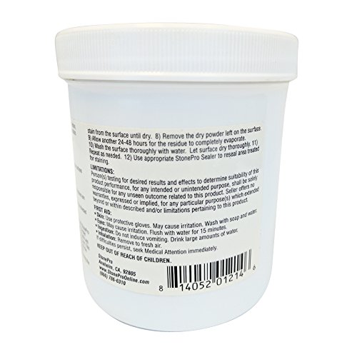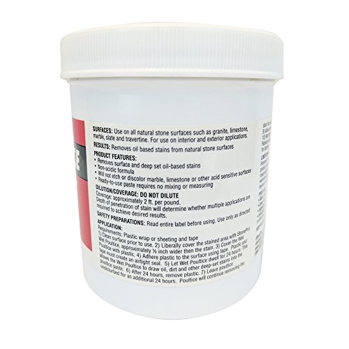 -. Binding : Kitchen -. Brand : Stone Pro -. EAN : 0814052012146 -. Feature : For granite, marble, limestone, slate, travertine and other natural stone surfaces / Safely removes surface and deep set oil-based stains / Easy alternative to restoration or replacement / For use on interior and exterior applications / Coverage: Approximately 2 ft. per pound. -. IsAutographed : 0 -. IsMemorabilia : 0 -. Label : Stone Pro -. Manufacturer : Stone Pro -. MPN : C-WP1 -. NumberOfItems : 1 -. PackageQuantity : 1 -. PartNumber : C-WP1 -. ProductGroup : Home -. ProductTypeName : HOME -. Publisher : Stone Pro -. Studio : Stone Pro -. Title : Stone Pro Wet Poultice - Removes Stains From Natural Stone - 1 Pound -. UPC : 773822852583