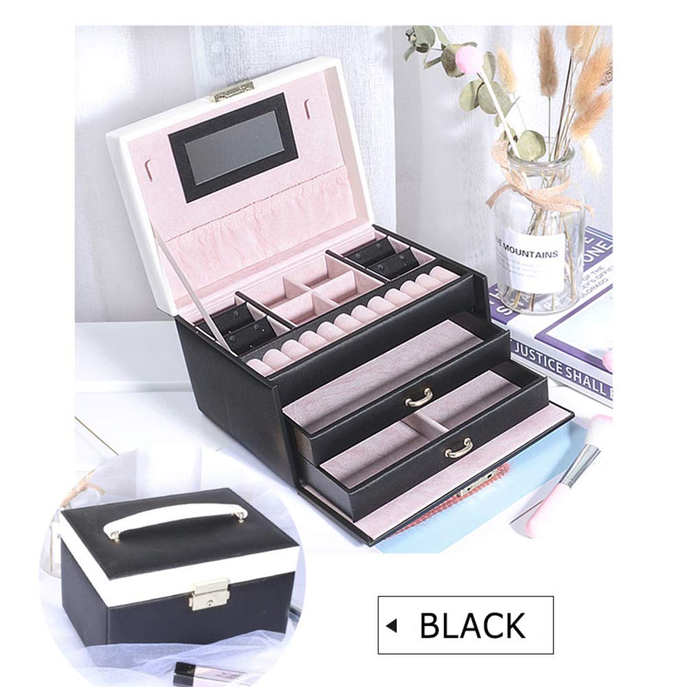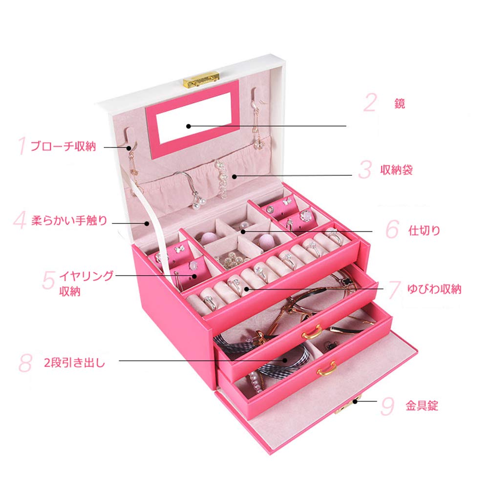 【サイズ】約18.5cm×13.5cm×12.5cm【重量】約750g【材質】PUレザー 3段あり(引出し2段)の収納空間があります。鍵ミラー付き、大容量に収納できる。 コンパクトで使いやすく、シンプルで上品な外観と柔らかな手触りを持ちます。また、持ち手もついており、持ち運びができ外出先で重宝します。 上品なPUレザーで高級感が溢れるジュエリーボックス、プレゼントにもぴったりです。