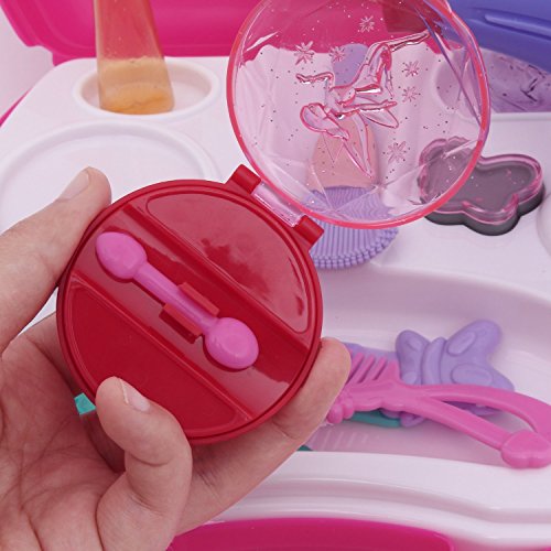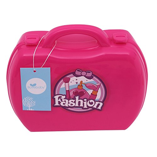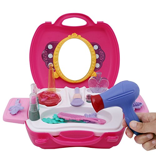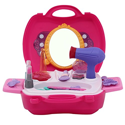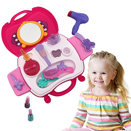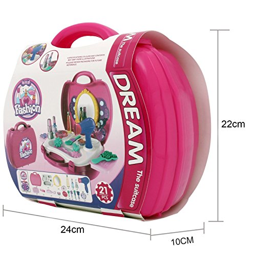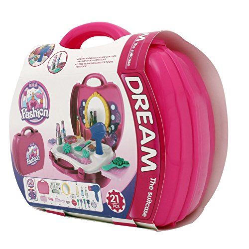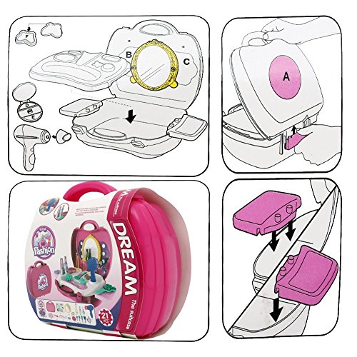 Safe and Fun We created the complete make up salon for your little girl with lot of accessories for hours of fun. Moreover we recreated the salon to look like a real one but it is 100% fake and doesn't have real makeup in it so you don't have to worry while your child is playing with this toys, you will not meet your daughter with weird makeup. Increase the imagination of your child We made it to let the imagination of your children run wild and the possibility to create their own stories and enjoy it, like being a beautiful princess moreover it will also increase their motors skills. Specifications Material: ABS Case size: 9.5x8.66x4 inch Color: Pink Package contains 1x Stickers 1x Pink case 1x Mirror 1x Comb 1x nail polish bottle 1x perfume bottle 1x Lotion bottle 1x Hairdryer 1x brush 1x make up brush 1x eye shadow make up case 1x lipstick 4x hair clips 1x Blush 2x removable make up tables 1x trayFeature