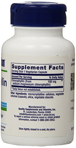 -. Binding : Health and Beauty -. Brand : Life Extension -. EAN : 0784922520081 -. Feature : Chlorophyll in also quenches all major oxygen species and acts to protect mitochondria / It also has a role in preventing unavoidable dietary exposure to afflation, a naturally occurring mycotoxin, by reducing its oral bioavailability. / Dietary Supplement -. IsAdultProduct : 0 -. Label : Life Extension -. LegalDisclaimer : These statements have not been evaluated by the FDA. These products are not intended to diagnose, treat, cure, or prevent any disease. -. Manufacturer : Life Extension -. Model : 737870157113 -. MPN : 01571 -. NumberOfItems : 1 -. PackageQuantity : 1 -. PartNumber : 01571 -. ProductGroup : Health and Beauty -. ProductTypeName : HEALTH_PERSONAL_CARE -. PublicationDate : 2013-01-20 -. Publisher : Life Extension -. ReleaseDate : 2013-01-31 -. Size : 100 count -. Studio : Life Extension -. Title : Life Extension Chlorophyllin 100 Mg Vegetarian Capsules, 100 Count -. UPC : 784922520081