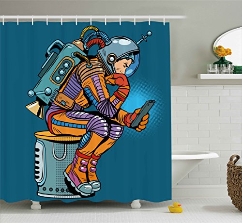 Outer Space Shower Curtain by Ambesonne, Illustration of Astronaut with a Smartphone Pop Art Retro Style, Fabric Bathroom Decor Set with Hooks, 70 Inches, Petrol Blue and Marigold