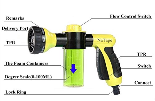 ★ BUILT-IN SOAP DISPENSER. Our NaTape garden hose nozzle designed with foam storage, can mix soap or fertilizer, 3-way foam flow control switch mode for you choose: less flow, medium flow and large flow