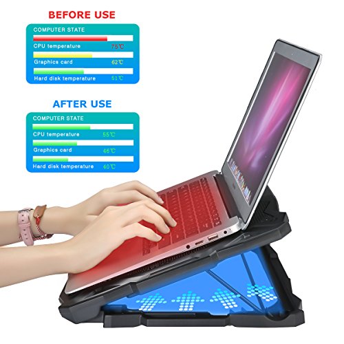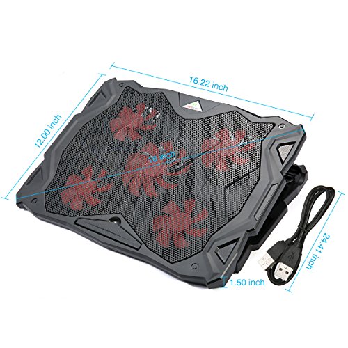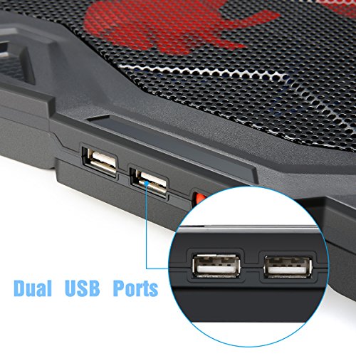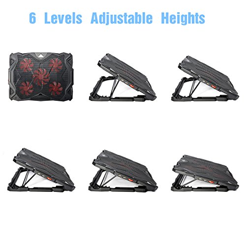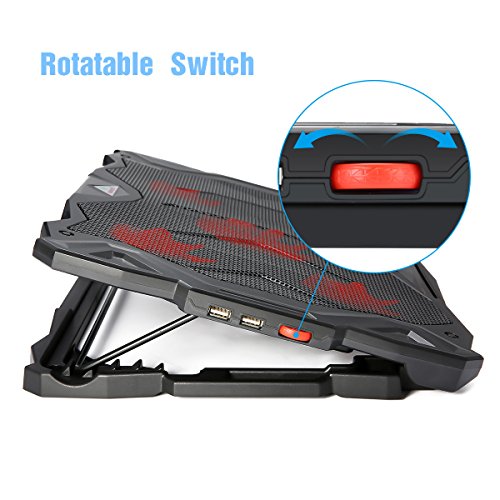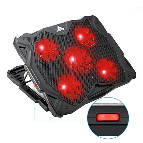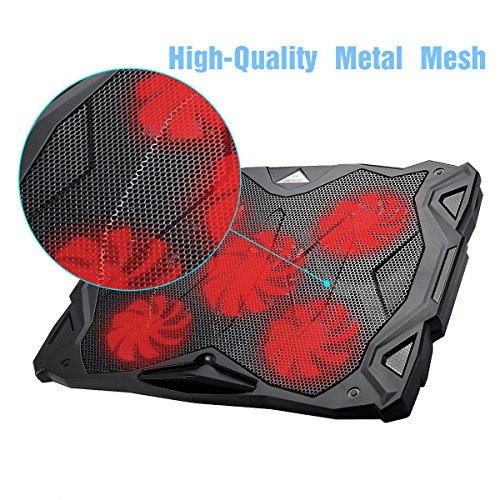 -. Feature : ➤Ultra-Quiet Five Fans: Five cooling fans with red LED lights take away the hot heat instantly ,which effectively protect your laptop from heating up and then prolong your laptop's life; / ➤Rotatable Switch: Rotate the roller switch to turn on/off the five fans and LED lights at the same time. You can also rotate the switch to control the speed of the fans(The brighter the light is, the faster the speed will be); / ➤Six Adjustable Heights: The ergonomic design laptop cooler with six adjustable height settings which can truly suit your needs, ensuring a better visual or typing angle to relieve neck & shoulder aching; / ➤High-Quality Metal Mesh: The laptop cooler is made of high-quality metal mesh which is durable to load 14-17 inch laptops and notebooks; / ➤Dual USB 2.0 Ports: Built-in dual USB ports for connecting more USB devices(includes one durable USB cable).