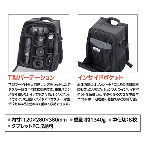 -. Feature : 内寸(約) : 奥行120×横幅280×高さ380mm / 製品重量(約) : 1,340g / 収納の目安 : 中級一眼レフ+交換レンズ3~4本程度+アクセサリー / 中仕切り8枚付属 / カラー : ブラック / 天蓋ポケット / ハンドベルト / U字型リュックベルト / 背面・背負いベルト、3Dクールメッシュ / 素早く開閉できるリングプルロッドスライダー
