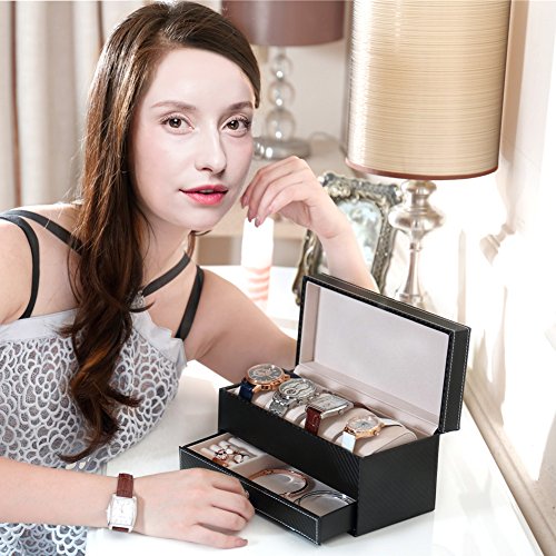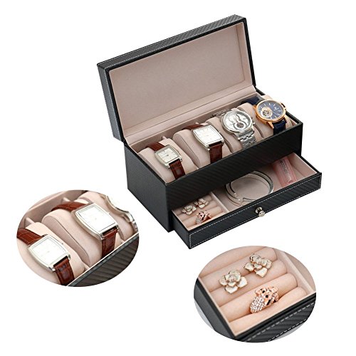 - MULTI-FUNCTIONAL SHOWCASE - The top layer has 4 compartments with 4 velvet watch cushion pillows.Also great for bracelets or necklets ect. or remove the cushion to make room for other accessories, such as storing cufflinks, earrings, bracelets and other items of jewelery. The bottom layer has a pull-out drawer with 7 ring& stud earring rolls and 1 big compartment to store cufflinks,tie clips,earrings,brooches, necklaces, money, cards or your watch tools.