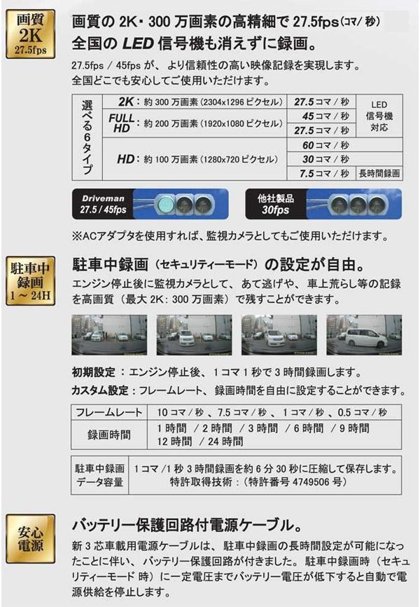 | 高画質2Kで駐車中録画でき、用途にあわせて設定自由!! |