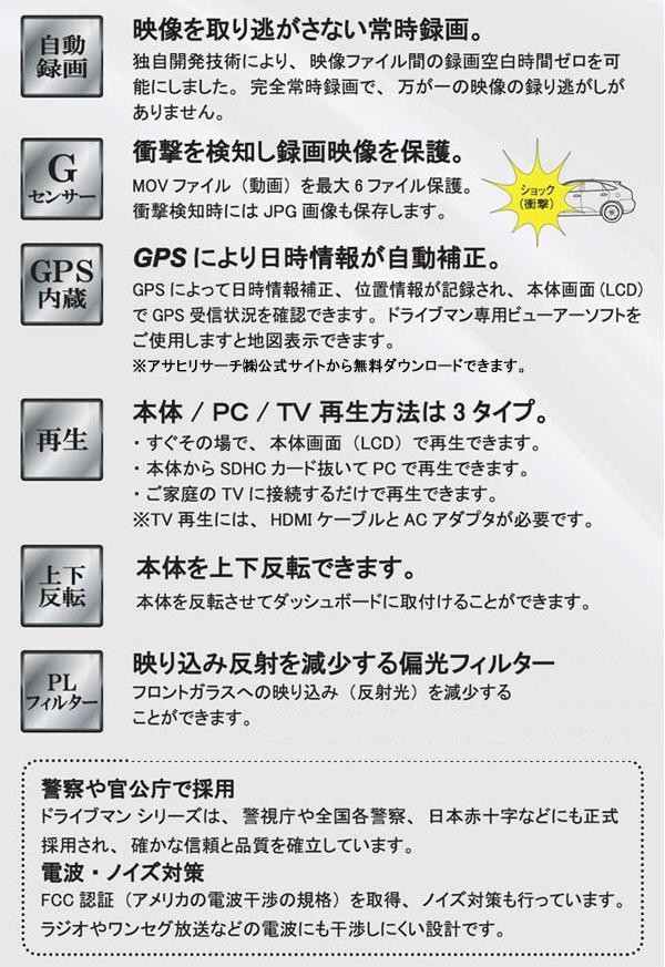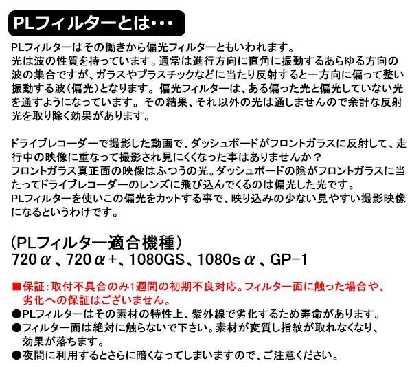 警察仕様モデル「PS-1」とGPS機能がついた「1080GS」が融合したハイスペックモデルのドライブレコーダーにPL(偏光)フィルターがセットになった商品です。PLフィルターを取り付けることにより、車内のダッシュボードがフロントガラスに写り込む事を大幅に削減することができます。 |
