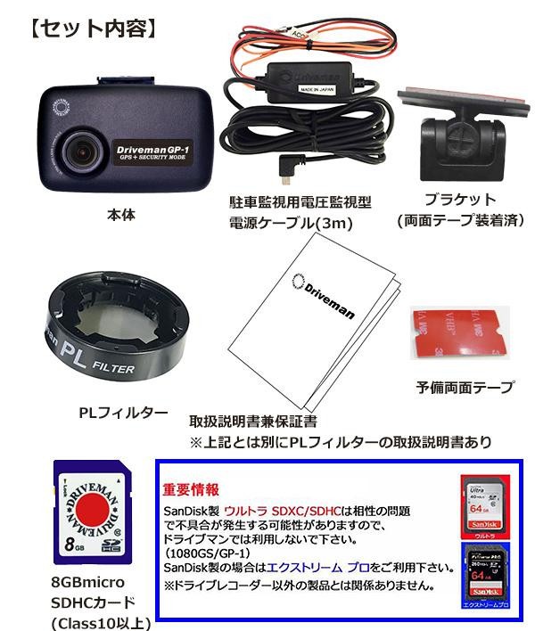 | セット内容 | 【GP-1】 本体 駐車監視用電圧監視型電源ケーブル(3m) ブラケット(両面テープ装着済) 予備両面テープ 8GBmicroSDHCカード(Class10以上) 取扱説明書兼保証書(保証期間:1年間) 【PLフィルター】 PLフィルター 取扱説明書 |