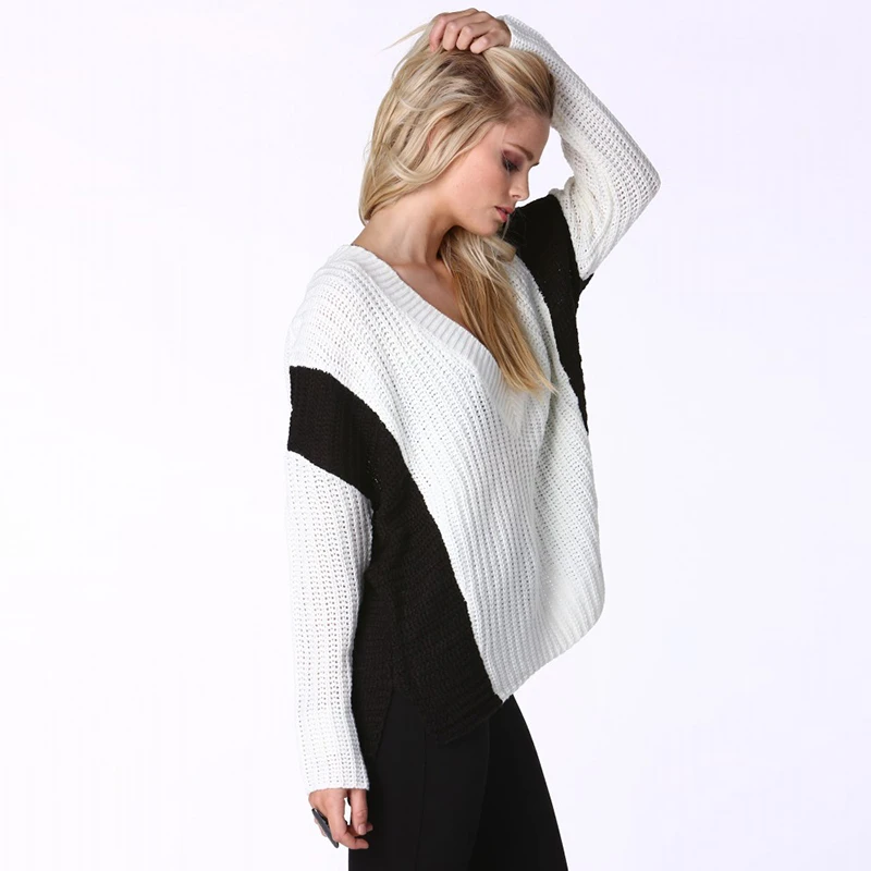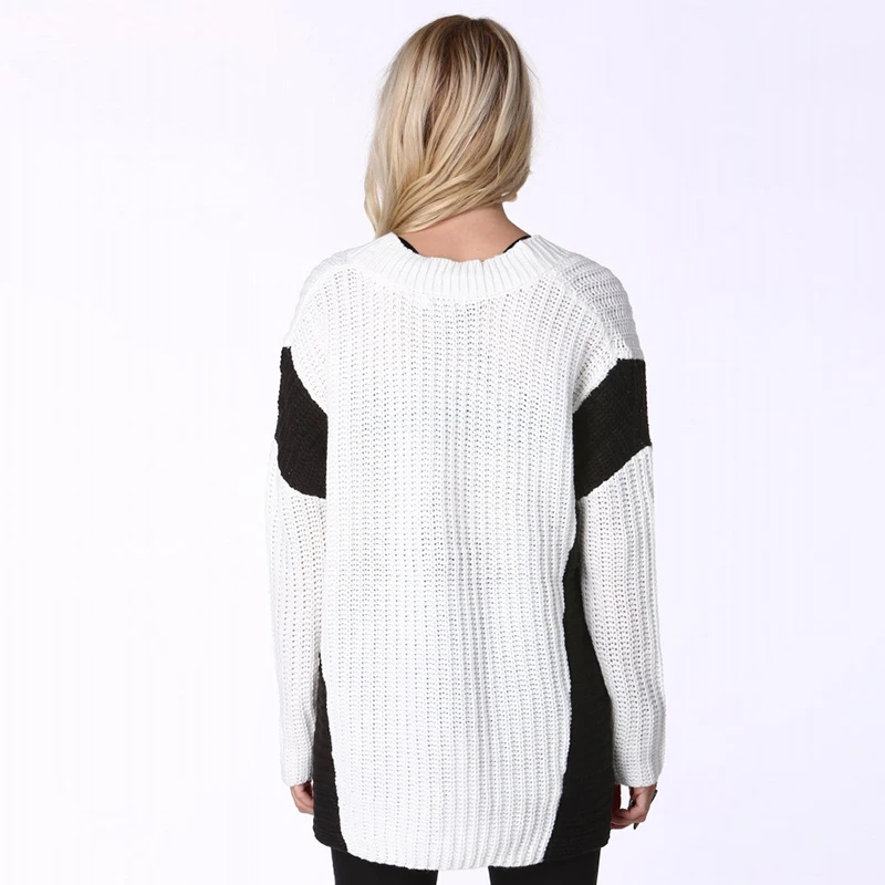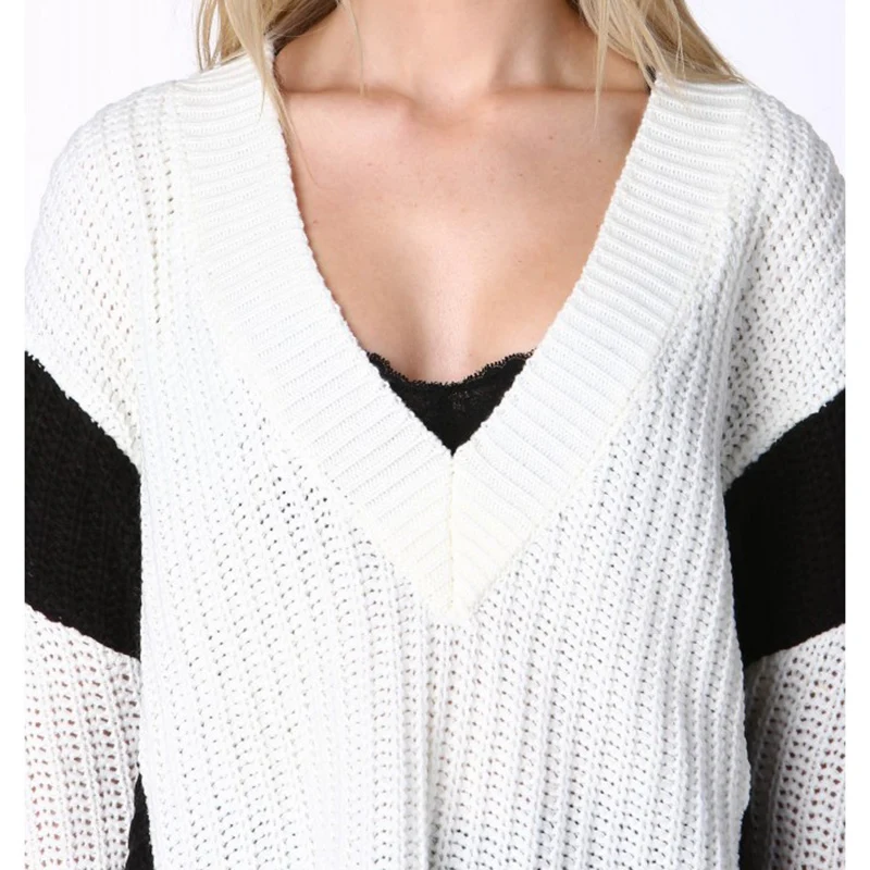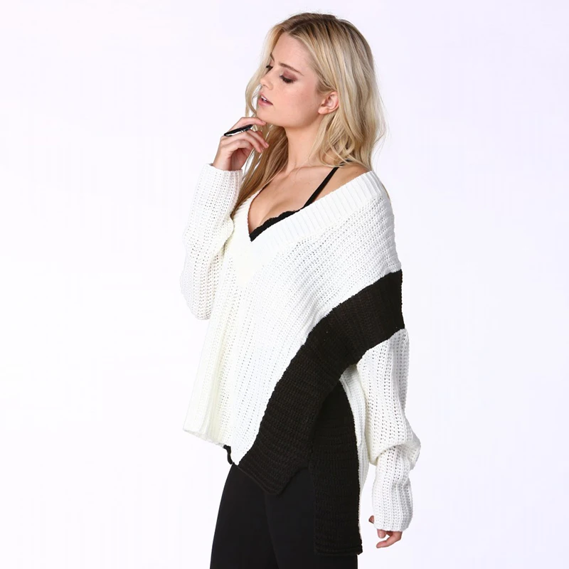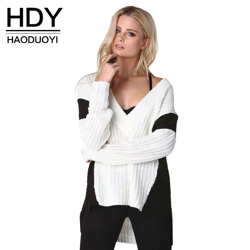 HDY Haoduoyi Color Block Women Sweatshirts V-neck Long Sleeve High Low Hem Kintted Tops For Women Female Contrast Pullovers | |||||||||||||||||||||||||||||||||||||||