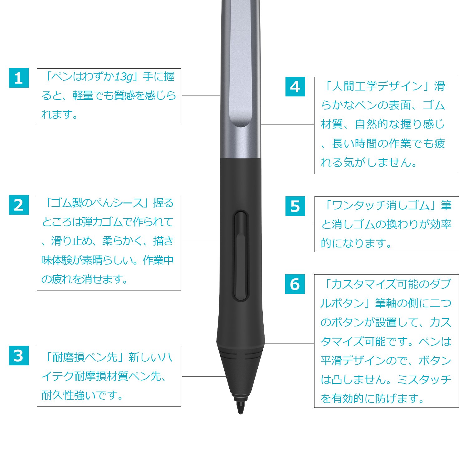 2, "Rubber Pen Sheath" The place to hold is made of elastic rubber, it is non-slip, soft and the drawing experience is wonderful.
