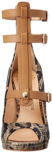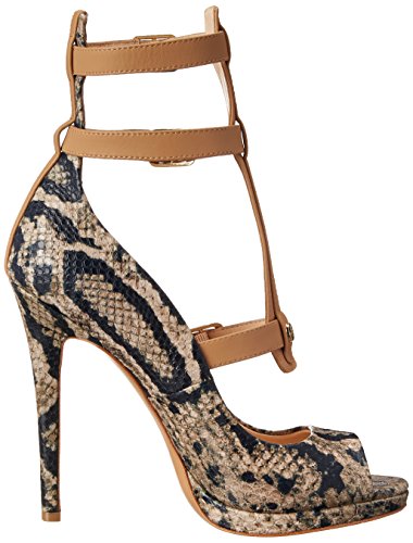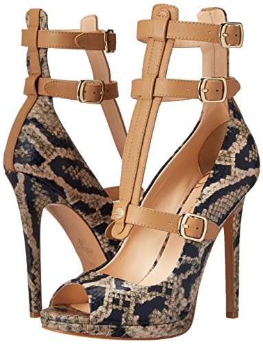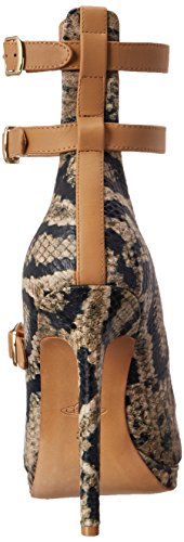 Gladiator-inspired platform sandal with snakeskin-pattern leather upper and multiple straps each with gold-tone buckle