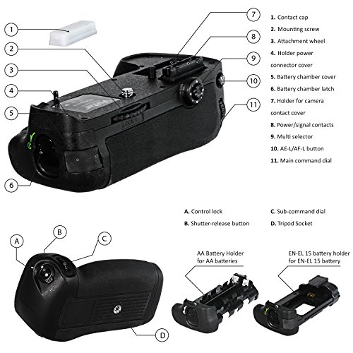 - The Vivitar MB-D14 Battery Grip is a comfortable and secure way to extend your battery life. It allows you to install one extra EN-EL15 battery to your camera to effectively double your shooting time. Furthermore, the grip can hold six AA batteries for emergency situations.