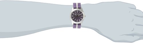 A simple stylish analog style unisex watch to show off to all your friends. Easy to read white dials with 12 hr markings, and smaller 24 hr military time. Stainless round 35.9 mm case sets off a cool nylon purple strap with a white line down the center.