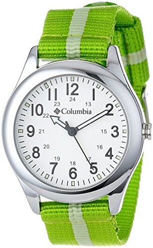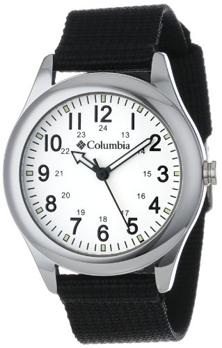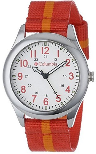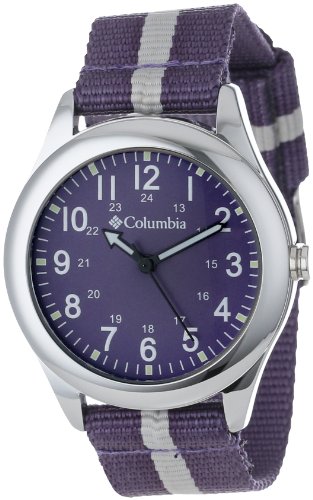 Brand: ColumbiaModel number: CA016510Item Shape: RoundDial window material type: MineralDisplay Type: AnalogClasp: BuckleCase material: MetalCase diameter: 35.9 millimetersCase Thickness: 9.8 millimetersBand Material: NylonBand length: UnisexBand width: 18.1 millimetersBand Color: PurpleDial color: WhiteBezel material:MetalBezel function: StationarySpecial features: Canvas StrapItem weight: 27.22 GramsMovement: QuartzWater resistant depth: 99 Feet