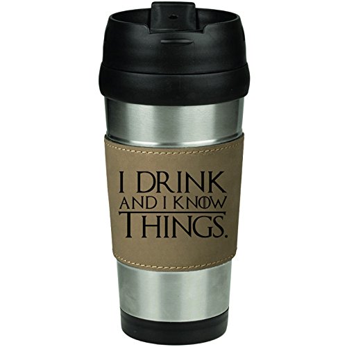 -. Title : Leather & Stainless Steel Insulated 16oz Travel Mug Funny I Drink And I Know Things