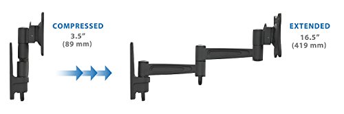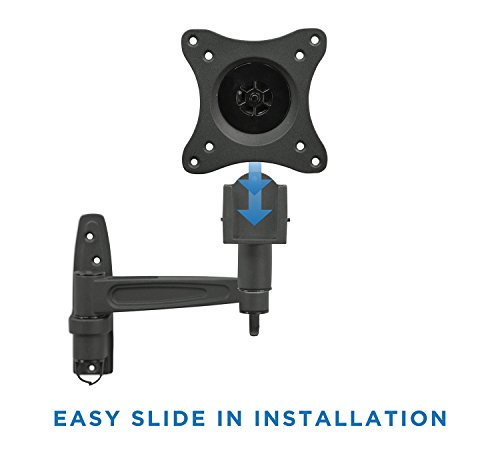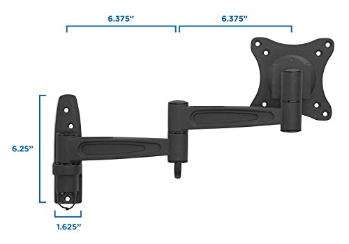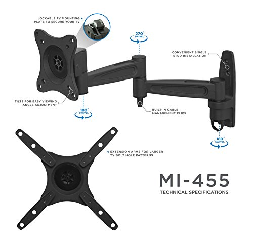 -. Binding : Electronics -. Brand : Mount-It! -. Color : Black -. EAN : 0045635109452 -. Feature : Tilt, swivel and rotate for maximum viewing flexibility; VESA plate can be taken off for easy installation / Effective cable management ; Space saving with its compact design; Maximum productivity and ergonomic comfort / Fits TVs between 23 inches and 42 inches/ Supports VESA up to 200 x 200. / Maximum TV weight should be 44lbs. / Range of motion: Tilt: 15 Degree up/down /Swivel: 180 degree / Extension from wall: 3.5" to 16.5" -. Label : Transform Partners LLC -. Manufacturer : Transform Partners LLC -. Model : MI-455 -. MPN : MI-455 -. PackageQuantity : 1 -. PartNumber : MI-455 -. ProductGroup : Speakers -. ProductTypeName : AV_FURNITURE -. Publisher : Transform Partners LLC -. Studio : Transform Partners LLC -. Title : Mount-It! LCD LED TV Wall Mount Full Motion with Swivel Articulating Arm for 17-37, up to 42 in TV Flat Panel Screen With VESA 200 100, 16 in extension -. UPC : 045635109452