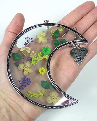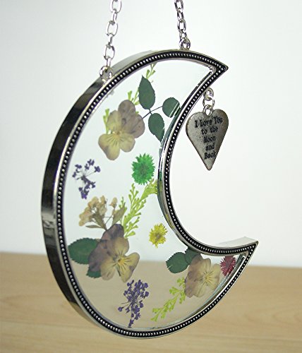 I Love You to the Moon and Back Suncatcher with Real Pressed Flowers in Glass and Silver Metal Heart Shaped Engraved Charm - Gift for a Loved One Wife Girlfriend Fiance
