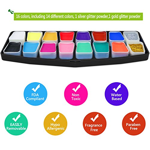- ※ COLORFUL FACE PAINTING - Fixget face painting kit including 14 vivid base colors, 1 gold powder, 1 silver powder, totally 16 colors to meet your needs. And it can be used for over 150+ faces. Great face paint for kids and adults.