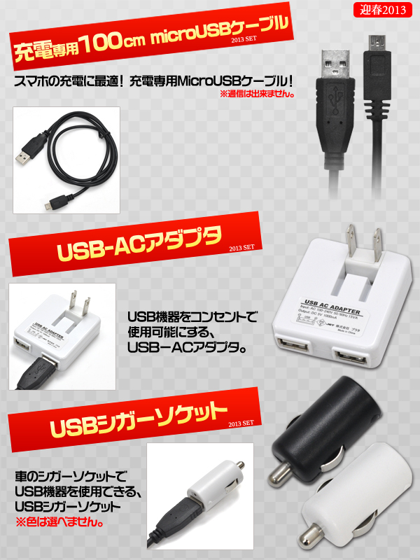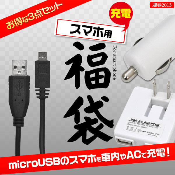 microUSBケーブル/USBシガーソケット/USB-ACアダプタ