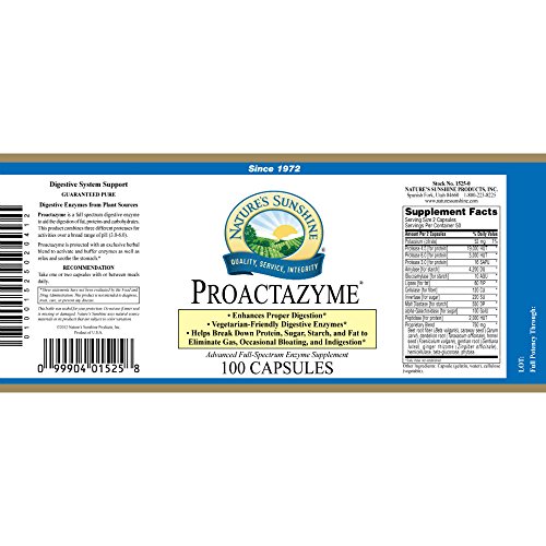 -. Binding : Health and Beauty -. Brand : Nature's Sunshine -. EAN : 0099904015258 -. Feature : From the world leader in herbs and health supplements -. IsAdultProduct : 0 -. Label : Nature's Sunshine -. LegalDisclaimer : These statements have not been evaluated by the Food and Drug Administration. This product is not intended to diagnose, treat, cure, or prevent any disease. -. Manufacturer : Nature's Sunshine -. MPN : 1525-0 -. PackageQuantity : 2 -. PartNumber : 1525-0 -. ProductGroup : Health and Beauty -. ProductTypeName : HEALTH_PERSONAL_CARE -. Publisher : Nature's Sunshine -. Studio : Nature's Sunshine -. Title : Nature's Sunshine Proactazyme 100 Capsules (Pack of 2) -. UPC : 099904015258