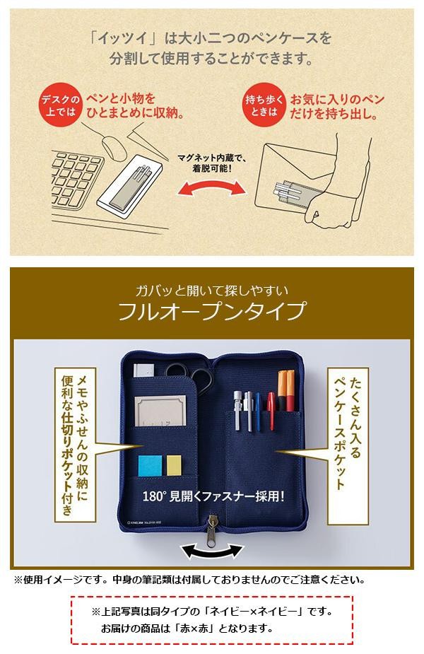 | 大小二つのサイズのペンケースが、マグネットで一体型になっているペンケースです。一つにまとめたり別々にして持ち歩くことが可能なので、使用するシーンに合わせて必要な容量のペンを持ち歩けます。開口部が180度開くフルオープンタイプで、中に入れたペンや小物を探しやすい構造です。メモやふせんの収納に便利な仕切りポケット付き。 |