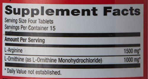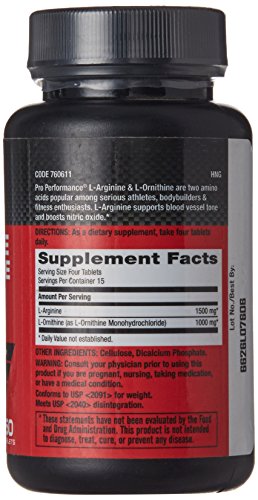 Free Form Amino Acid Complex 1500 mg L-Arginine Per Serving 1000 mg L-Ornithine Per Serving Pro Performance L-Arginine and L-Ornithine combine two amino acids that are a popular choice among bodybuilders, weightlifters and serious athletes. L-Arginine is involved in the removal of ammonia from the body and is also involved in the production of creatine.* L-Ornithine has been added to provide additional dietary support. *This statement has not been evaluated by the Food and Drug Administration. This product is not intended to diagnose, treat, cure, or prevent any disease. Conforms to USP 2091 for weight. Meets USP 2040 disintegration.Feature