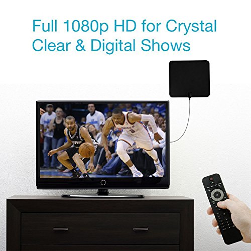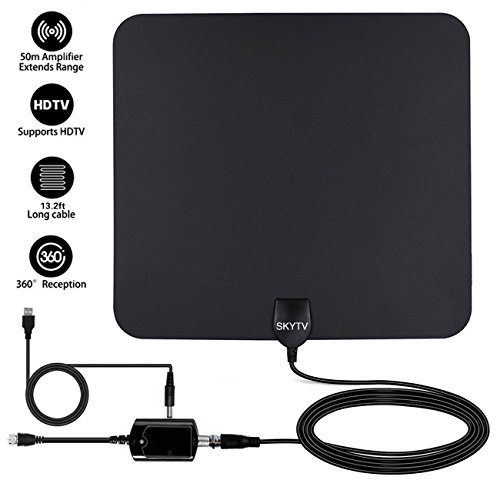 Studio : SKYTV Publisher : SKYTV Binding : Electronics Product Description Amplified HDTV Antenna, SKYTV Indoor Digital TV Antenna 50 Mile Range with Detachable Amplifier Signal Booster, USB PowerSupply and 13.2FT Coax Cable - Upgraded Version Cut the cable and get access to HD programs forever including local news, weather forecast and sitcoms,kids and sports programs,etc. Enjoy crystal clear HDTV shows,720p,1080i,1080p,4K|ATSC available. Specification Range: 50 miles with amplifier Connectors: F Male,Voltage:5V Power supply connector: USB Before you buy, visit antennaweb or antennapoint check how many broadcast towers surrounding you within 50miles. Easy to set tup 1) Connect to 'ANT IN' on the back of any digital TV. 2) Place amplified antenna in an optimal position, usually window or on a wall. 3) Scan channels by selecting 'Menu' then 'Channel Search' and you are ready to enjoy your best TV programs. Package: 1) Skytv indoor TV antenna with 13.2ft coax cable 2) USB power adapter with spare cable 3) Amplifier signal booster 4) Spare 3M sticker If your Indoor TV antenna is not working as expected, try the following tips: 1, Check to make sure you have correctly connected the antenna to your HDTV or third-party HD receiver. 2, Re-scan for channels: In the TV's setup menu, set the mode to indoor antenna or air. Refer to the TV manual for detailed instructions. 3, Reposition the amplifier antenna in a different location. It is suggested place it higher on a wall or closer to a window. Sometimes moving a few feet can make a difference. 4, keep the indoor antenna away from those big power consumption devices interference, such as air conditioner, refrigerator and microwave oven,etc. 5, This is an amplified TV antenna. If a signal cannot be received with the external amplifier, remove the antenna amplifier and try again. Using the antenna Now and Cut the cable and get access to HD programs forever. 0