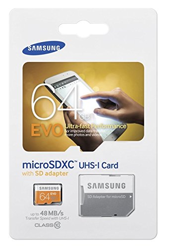 Samsung microSD 64GB EVO Memory Card Save the moments of a lifetime. For a lifetime. Get the most out of your smartphone or tablet PC with Samsung's EVO 64GB microSD Memory Card. This high-performance memory card features read speeds of up to 48 MB/s for transferring music, photos, and videos and is UHS-1 enabled to capture Full HD video. Waterproof, temperature proof, magnet proof, and X-ray proof, this reliable memory card ensures your files remain safe during life's little mishaps. An included SD adapter lets you use the card with your digital camera, laptop, or desktop computer Includes SD Adapter for Use with PCs and Digital Cameras The Samsung EVO 64GB microSD Memory Card includes an adapter so you can use your card with SD-enabled devices such as digital cameras, laptops, and printers. This lets you easily transfer photos, music, and video content from your mobile deviceFeature