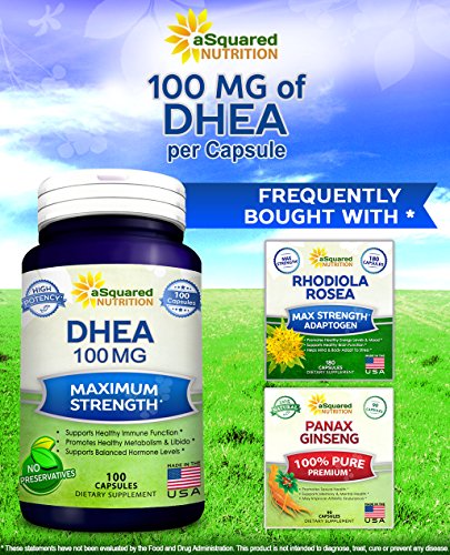 HIGHEST QUALITY DHEA - 100% MONEY BACK GUARANTEED: Rest assured that we use the highest quality ingredients in our DHEA 100mg formula. Our supplements go through stringent quality control testing. As always, this DHEA complex is backed by our 100% Money Back Guarantee for 30 days. If you are dissatisfied you have 30 days to return it for a full refund. Also try aSquared Nutrition's Panax Ginseng, Rhodiola Rosea, CoQ10 (coenzyme Q10) 200mg or 400mg, Turmeric Curcumin & Resveratrol 1000mg. *