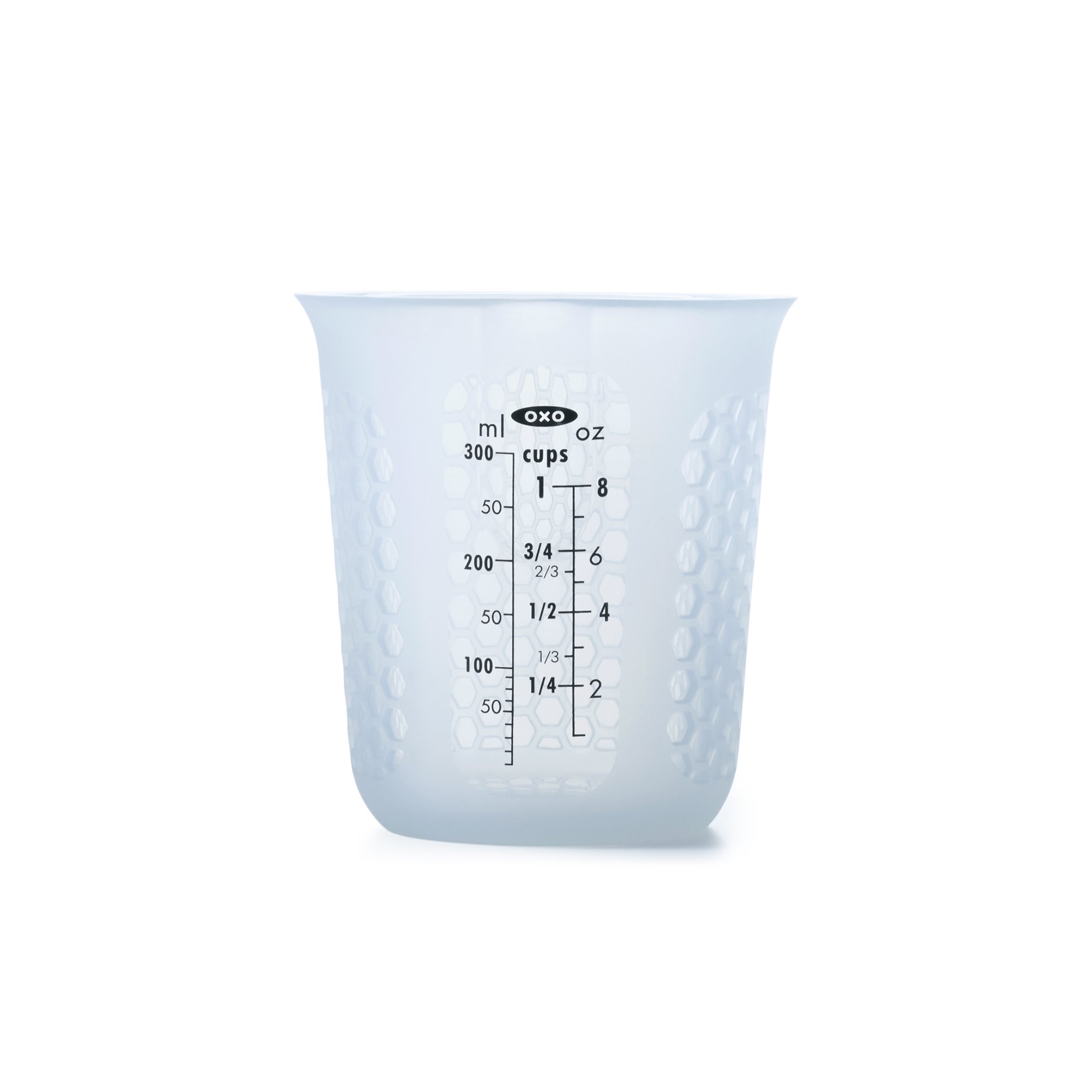It is a semi-transparent thick silicone cup that is bluish. I put butter, chocolate, milk and tried to melt or warm it in a microwave oven, but because of the honeycomb-like unevenness on the surface, it can feel as if it feels warm and can have it as it is. However, I think that it is difficult to get dirty. Because it is silicone rubber, it is not slippery and stable even when it is placed on the kitchen table. The inside is smooth and soft, and it is made thinner from the middle of the weighing scale to the mouth, so it is easy to pour the mouth and pour it into other containers. Although I use some OXO products, they are also very easy to use, as they have been devised for detailed matters.
