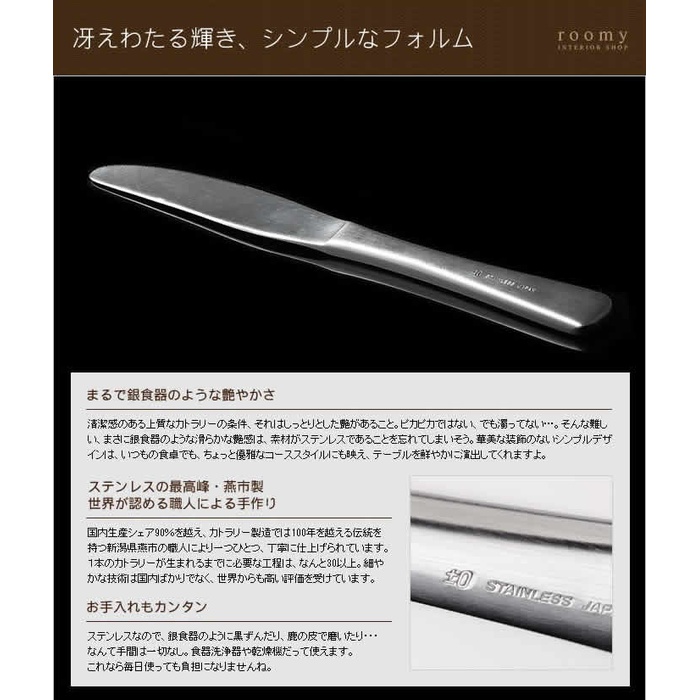 ■ 프라 마이 제로 / 디저트 나이프 세계적인 인기를 뽐내는 커트러리 제조지니가타현 연도시의 직공(직인)에 의해 하나 하나 정중하게 완성되고, 은식기와 같은 요염함과 매끄러운 포름과,일본 사람의 손을 연구 하고, 사용하기 쉬움과 쥐기 쉬움 을(를) 고집한 플러스 마이너스 제로의 커트러리 시리즈.『 디저트 나이프 』서는,빵 케익 등의 디저트는 물론,아침식사나 런치로도◎.같은 시리즈에 10종류의 아이템을 준비.