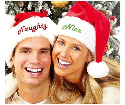 Product Description Add some fun and spirit to any holiday occasion with KOVOT Nice Naughty Santa Hat Set. The set includes (1) Santa hat with "Naughty" embroidered in red (1) Santa hat with "Nice" embroidered in green. These hats are made of soft plush constructed by Santas elves themselves. Perfect attire for holiday parties, family gatherings, or just to keep your head warm all season long. Each hat measures: 18″H With An 8″ Opening - One size fits most adults. 0