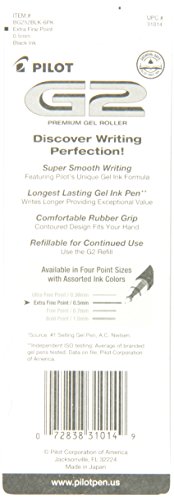 -. Binding : Office Product -. Brand : Pilot -. Color : Black -. EAN : 0809302281335 -. Feature : G2 writes longer than the average of the top branded gel ink pens.** / **Independent third party ISO testing. Average of G2 write out (all point sizes) compared to the average of the top branded gel ink pens tested (all point sizes). Data on file with Pilot Corporation of America. / Contoured rubber grip for writing comfort / Pack of 2 extra fine point pens with black ink / Dynamic Gel Ink Formula that's smooth writing and smear-proof - Retractable and refillable - Pilot G2 refill model #77232 sold separately -. Label : Pilot Pen Corporation of America -. Manufacturer : Pilot Pen Corporation of America -. Model : 31014 -. MPN : 31014 -. NumberOfItems : 1 -. PackageQuantity : 1 -. PartNumber : 31014 -. ProductGroup : Office Product -. ProductTypeName : WRITING_INSTRUMENT -. PublicationDate : 2011-06-16 -. Publisher : Pilot Pen Corporation of America -. Size : 2-Pack -. SKU : PIL31014 -. Studio : Pilot Pen Corporation of America -. Title : Pilot G2 Retractable Premium Gel Ink Roller Ball Pens, Extra Fine Point, 2-Pack, Black Ink (31014) -. UPC : 072838310149