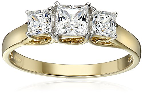 Three square-shaped Swarovski cubic zirconia stones create a classic three stone ring setting along the top of this 10k yellow gold band. Cubic zirconia stones are an affordable aalternative to diamonds.Feature