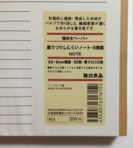 MUJI Notebook A5 6mm Rule 30sheets - Pack of 5books [5colors Binding]