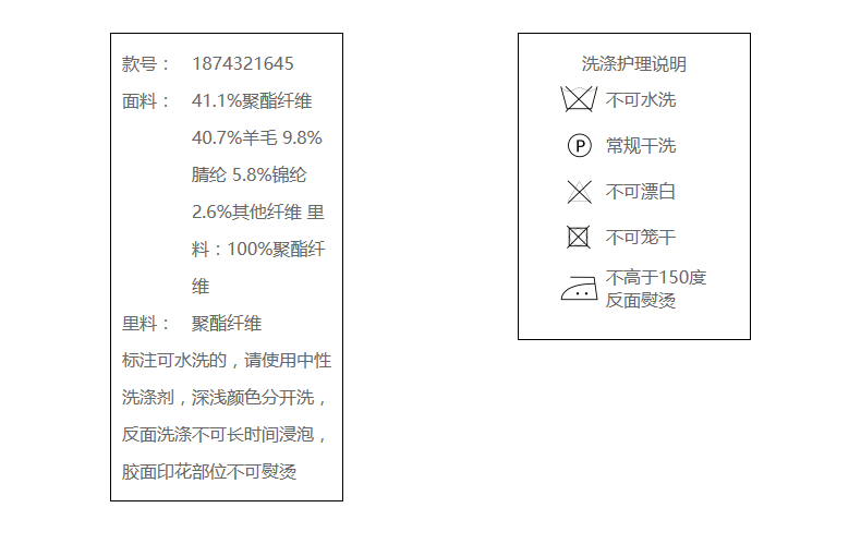 41.1%聚酯纤维 40.7%羊毛 9.8%腈纶 5.8%锦纶 2.6%其他纤维 里料:100%聚酯纤维