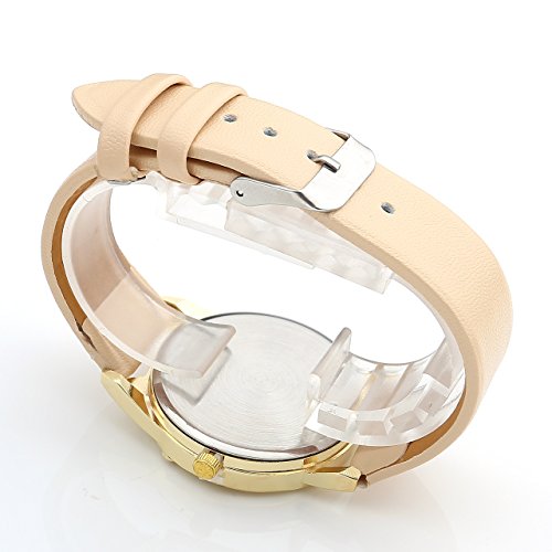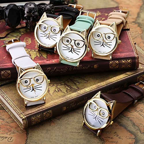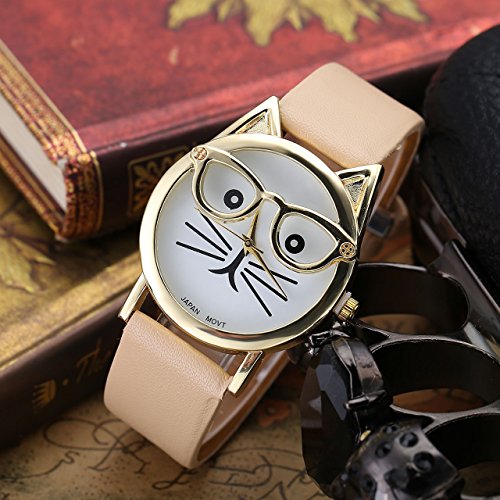 Top Plaza Fashion Women's Platinum Plated Mini Cat Glasses Analog Quartz Watch, PU Leather Strap Gold Tone - Beige Brown