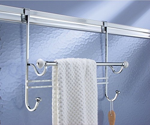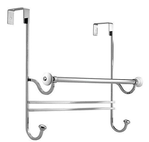 mDesign Bathroom Over Shower Door Towel Bar Rack with Hooks - White/Chrome