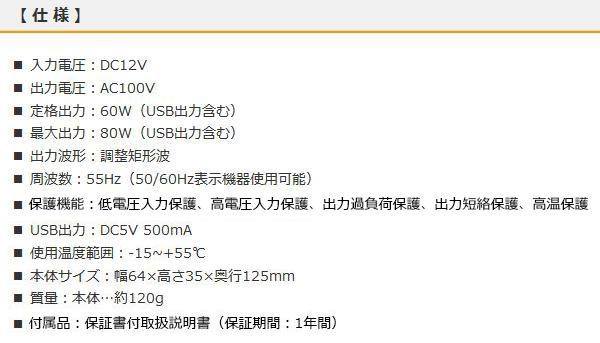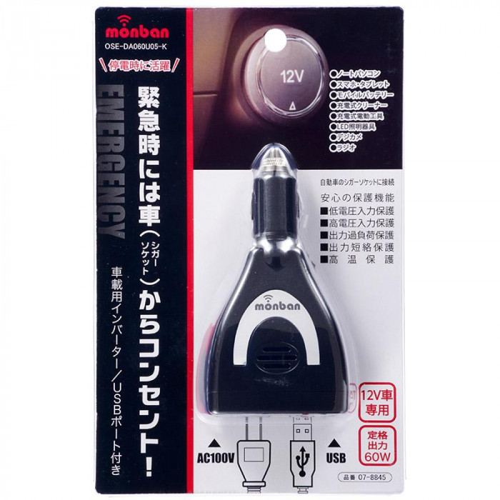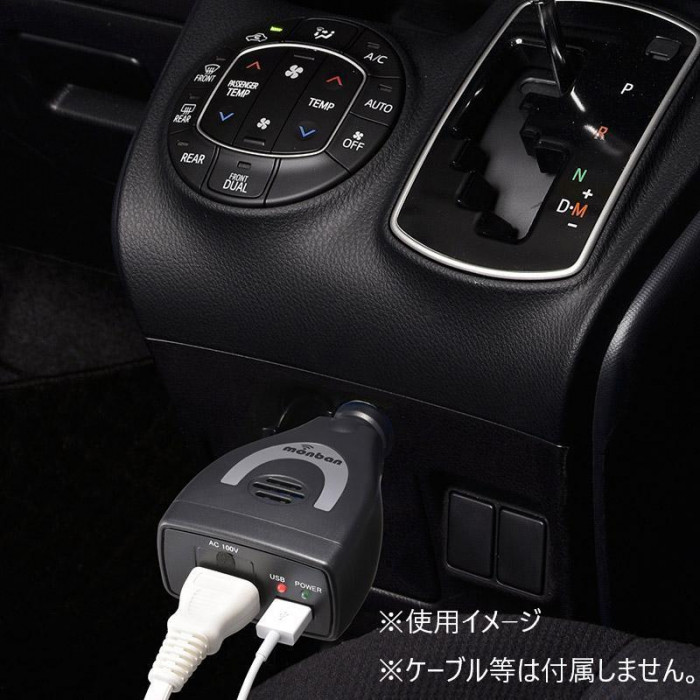 | 車のシガーライターソケット(アクセサリーソケットDC12V)に接続して、家庭用電源(AC100V)とUSB電源(DC5V)を供給できます。停電時のパソコン、スマートフォン、クリーナー、電動工具などの充電にも便利♪安心の保護機能付きで、本機に異常が生じた場合は保護回路が作動します。 |