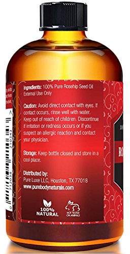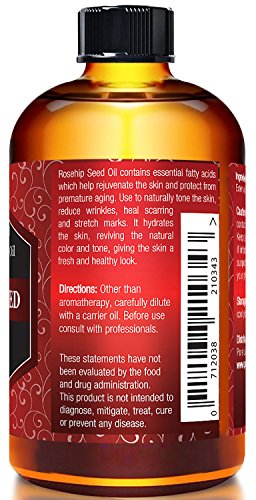 -. Feature : ROSEHIP OIL - 100% PURE and ORGANIC - Cold pressed, fresh and high quality, no additives or fillers. / SKIN CARE: Rose hip seed oil is known to reduce the appearance of stretch marks, fine lines and scars; firms the skin and keeps it hydrated and supple. / Rose hip seed oil is known to work for a variety of skin conditions, including dermatitis, acne and eczema, it helps improve skin tone, texture and elasticity. ROSE HIP OIL IS RICH IN VITAMIN A: Helps skin return to youthful appearance. It tends to slow down and reverse typical signs of aging such as wrinkles and sagging skin by accelerating the skin's cellular activity. It also adds shine and body to colored hair, permed hair, or hair that has been damaged by too much sun or cold weather. / SAFETY WARNING: For external use only. Rub a very small amount on the inside of your elbow area to test for any allergic reaction before use. Avoid contact with eyes, keep out of the reach of children. If pregnant, consult with your health care provider before use