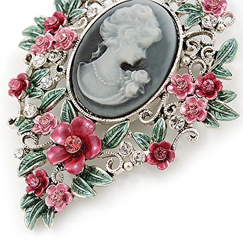 -. Title : Pink/ Green Floral Cameo Brooch In Silver Tone - 70mm L
